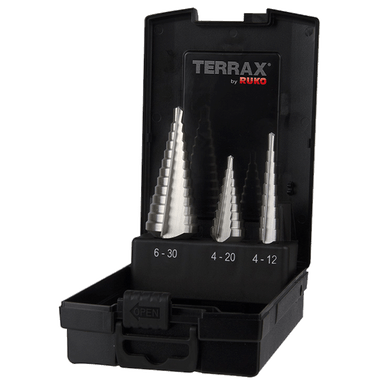 RukoHigh Speed Steel Split Point Spiral Flute Step Drill Set of 3 from RUKO.Choose between a Steel Case of 3 or a Plastic Case of 3. The CBN ground and...
