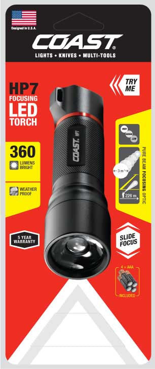CoastLength: 142mm, Case material: Aircraft grade aluminium, Max. run time: 8hrs, Beam distance: 224m, Brightness: 345 Lumens, Batteries: 4 x AAA