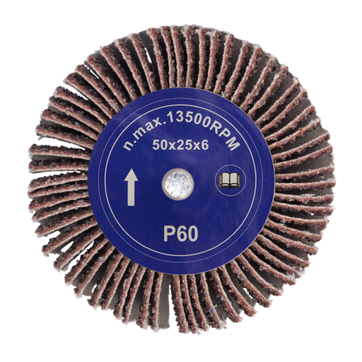 SEALEYAluminium oxide abrasive flap wheel on 6mm shaft. Suitable for use with power drills. Ø50 x 25mm. 60Grit.